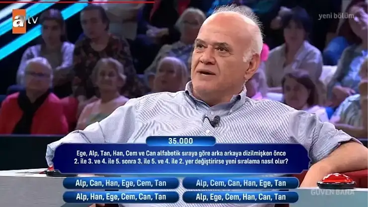 Güven Bana programında sorulan soruların cevapları merak ediliyor. Peki, Ege, Alp, Tan, Han, Cem ve Can alfabetik sıraya göre arka arkaya dizilmişken önce 2. ile 3.ve 4. ile 5. sonra 4. ile 2.yer değiştirirse yeni sıralama nasıl olur? sorusu cevabı ne?