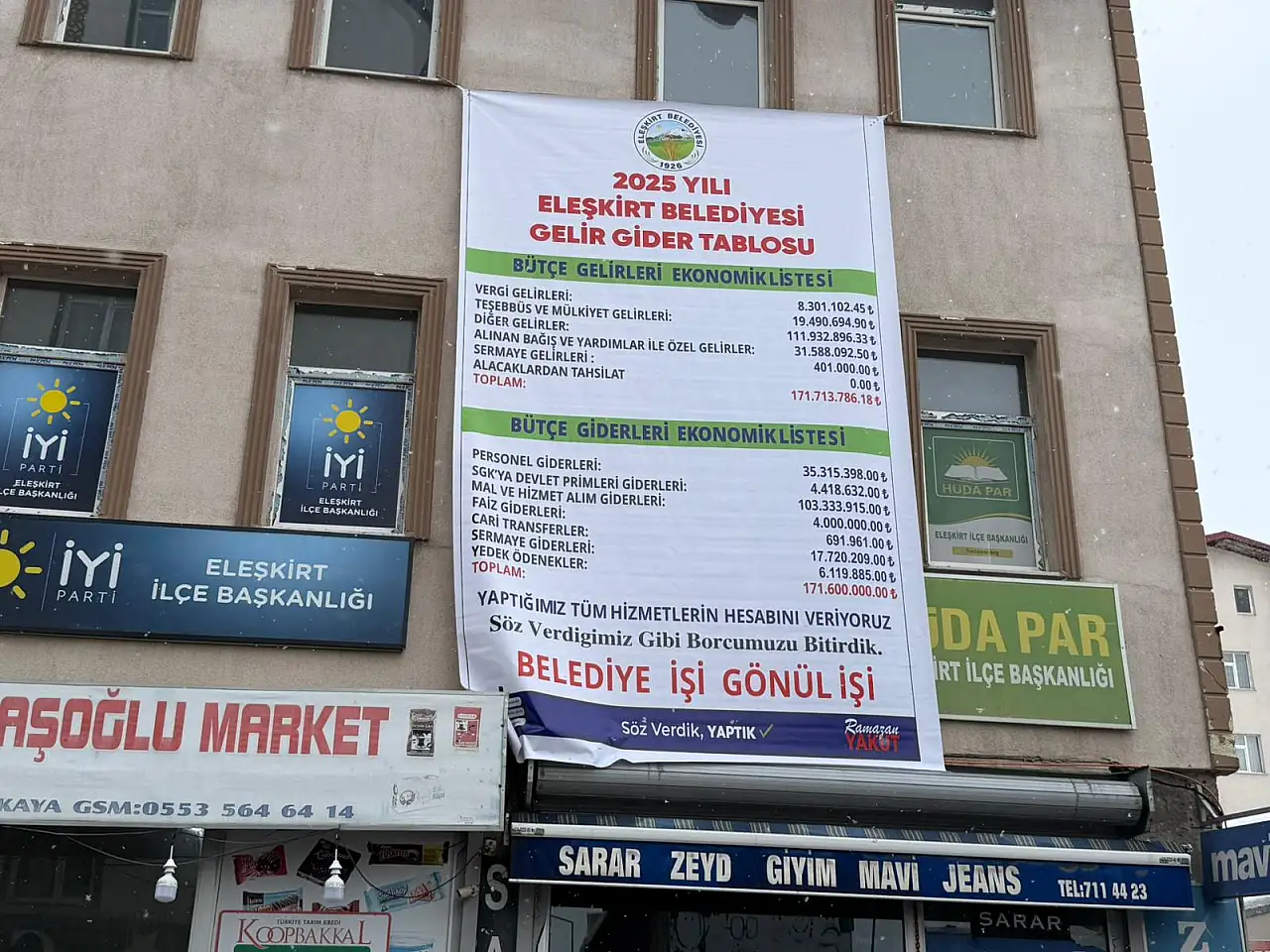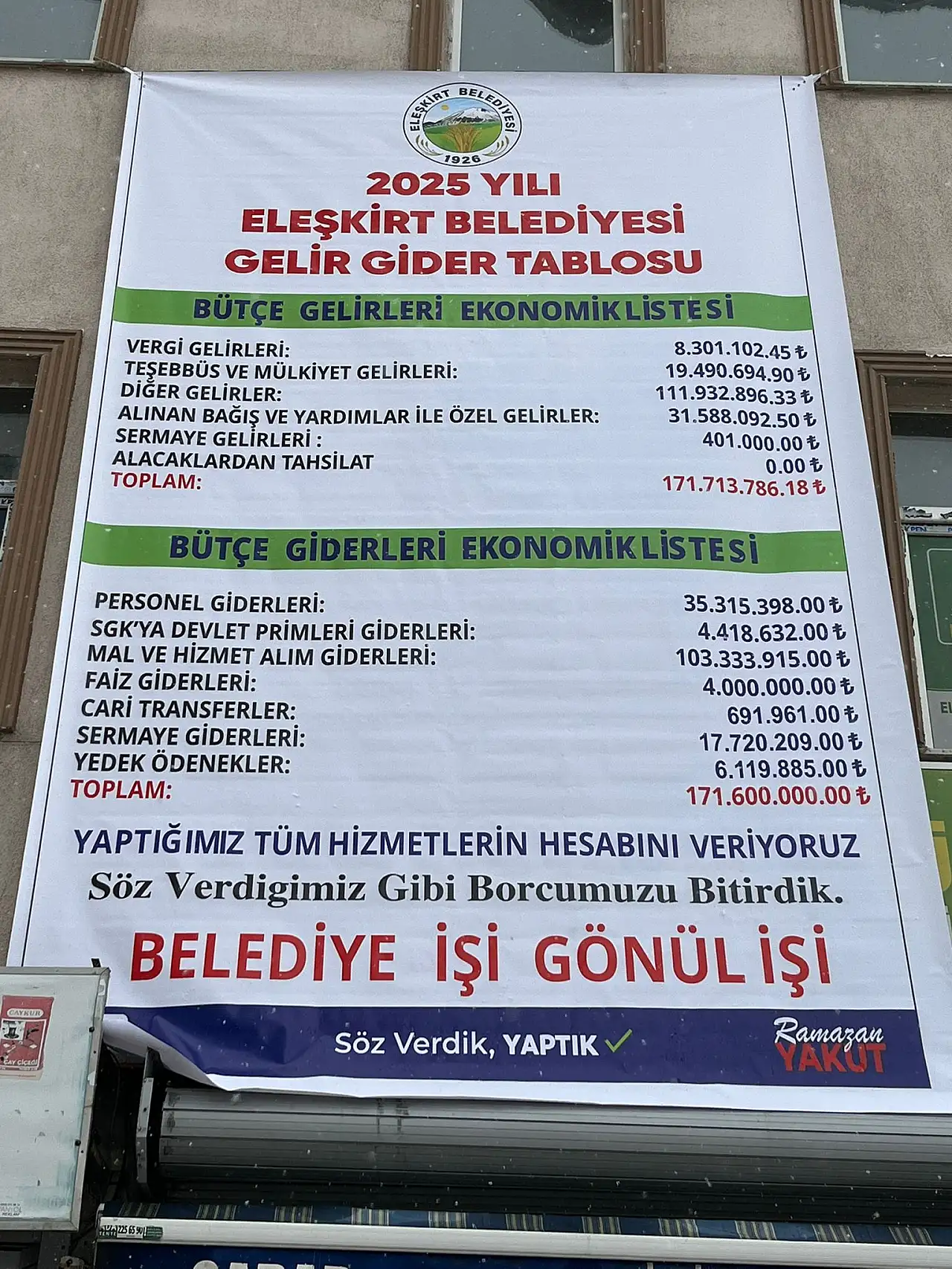 Eleşkirt Belediyesi, 2025 yılına ait gelir-gider tablosunu kamuoyuyla paylaştı. Belediye Başkanı Ramazan Yakut, şeffaflık ilkesine dayanarak tüm hizmetlerin hesabını verdiklerini ve her zaman halkın yanında olduklarını söyledi: