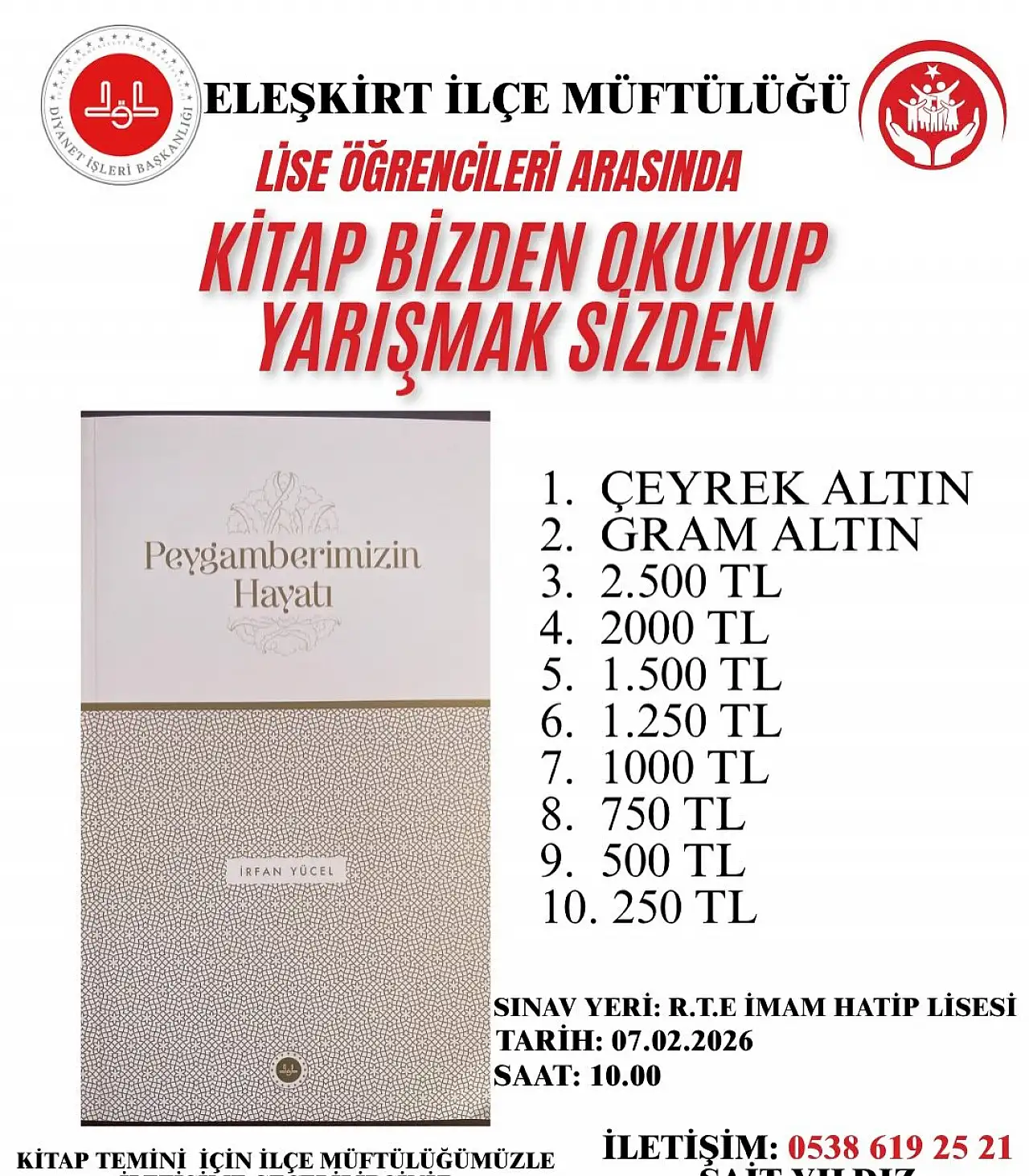 Eleşkirt İlçe Müftülüğü tarafından lise öğrencilerine yönelik hayata geçirilen “Kitap Bizden Okuyup Yarışmak Sizden” projesi kapsamında düzenlenen kitap okuma yarışmasının sonuçları ilan edildi. 7 Şubat 2026 tarihinde gerçekleştirilen yarışma, ilçedeki farklı liselerde öğrenim gören öğrencilerin katılımıyla yapıldı.