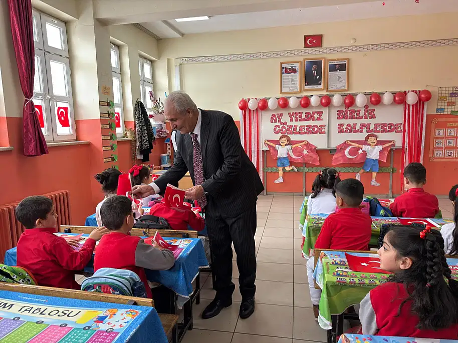 Eleşkirt Cengiz Topel İlkokulu'nda düzenlenen ziyarette Belediye Başkanı Ramazan Yakut ve İlçe Milli Eğitim Müdürü Burhan Kurt, öğrencilerle bir araya gelerek bayrak dağıttı ve bayrak sevgisinin önemini anlattı.