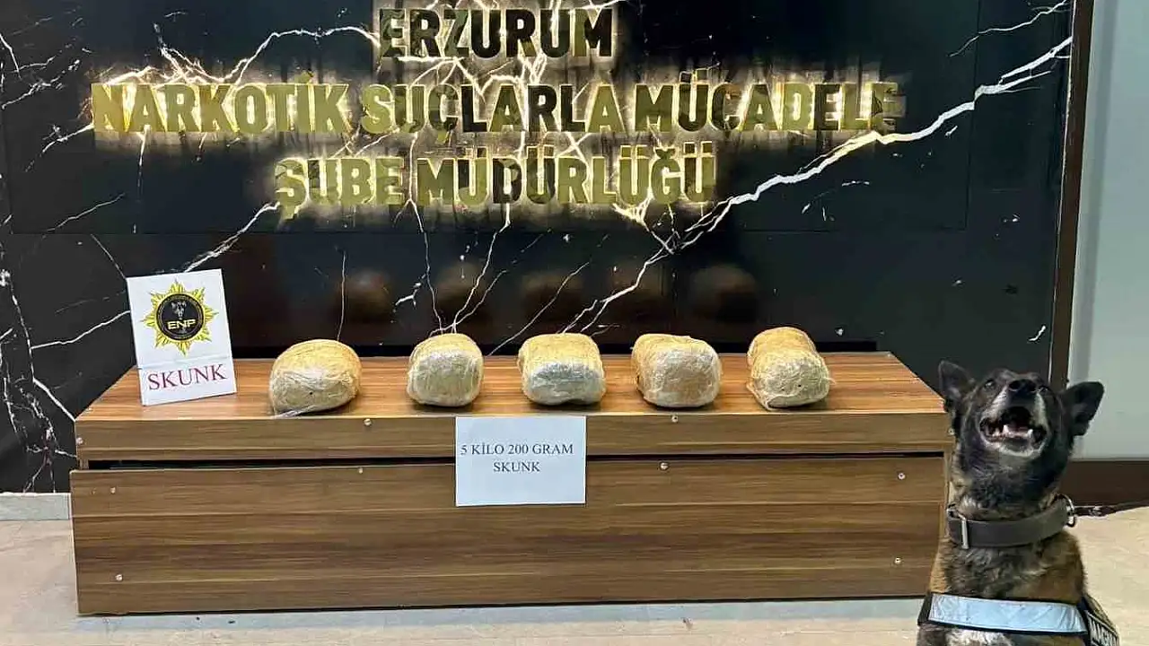 Erzurum’da polis ekiplerinin düzenlediği operasyonda 5 kilo 200 gram skunk maddesi ele geçirildi.