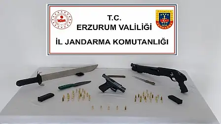 Erzurum İl Jandarma Komutanlığı Kaçakçılık ve Organize Suçlarla Mücadele Şube Müdürlüğü koordinesinde; Horasan ilçesinde gerçekleştirilen operasyonda 1 şahsa ait ev ve iş yerinde yapılan aramada; 1 adet ruhsatsız tabanca, 1 adet ruhsatsız av tüfeği, 2 adet tabanca şarjörü, 47 adet 9 mm fişek, 1 adet kama bıçak, 1 adet bıçak, 1 adet kılıç ele geçirildi. Olay şüphelisi 1 şahıs hakkında, Cumhuriyet Savcısı’nın talimatıyla adli işlemler başlatıldı.