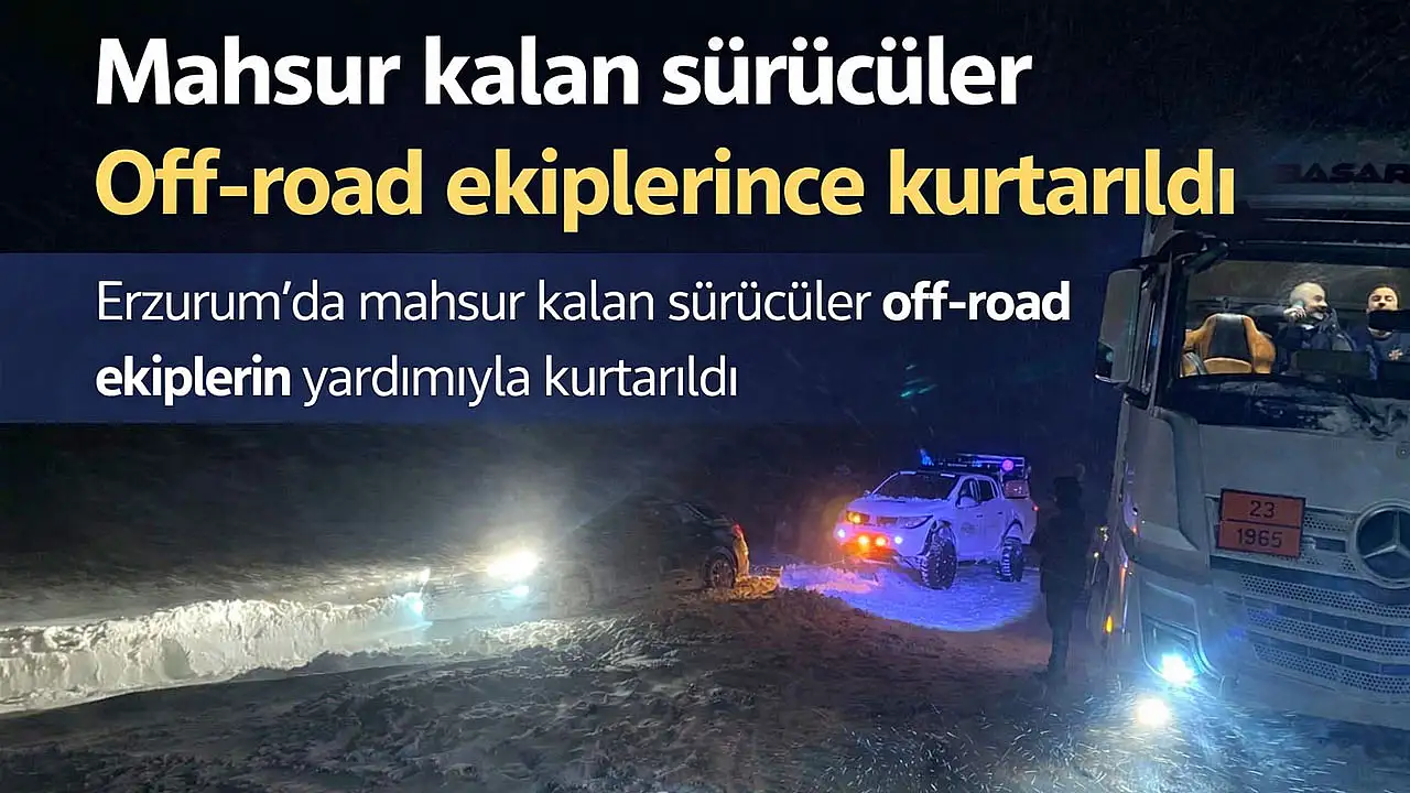 Erzurum'da yoğun kar yağışı nedeniyle yolda mahsur kalan sürücüler, Erzurum Macera Offroad Arama Kurtarma ekibinin yardımıyla kurtarıldı. Ekip, kırsal bölgelerde de 24 saat hizmet vererek, ihtiyaç duyan vatandaşların yardımına koşuyor.