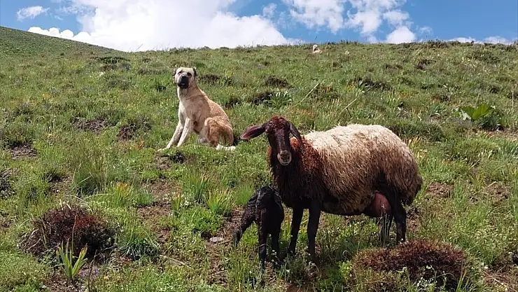 Erzurum'un Karayazı ilçesinde, iki gündür kayıp olan Kangal cinsi çoban köpeği, yaylada doğum yapan koyunla yavrusunu korurken bulundu.