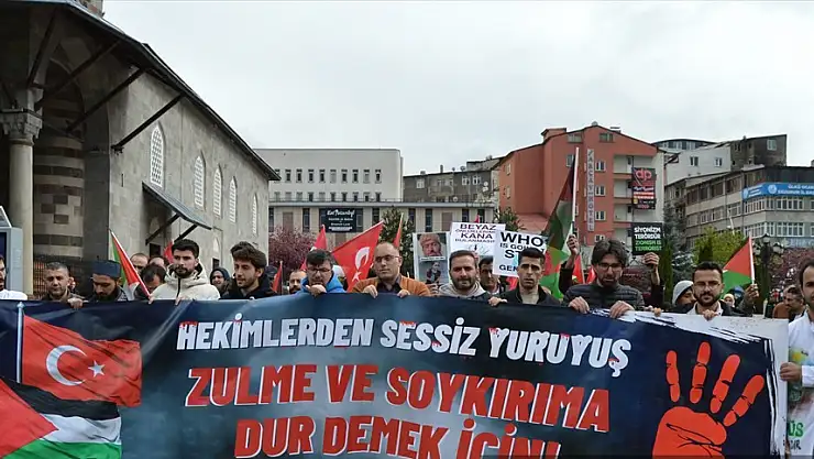 Kent merkezindeki Lalapaşa Camisi önünde bir araya gelen doktorlar, tıp fakültesi öğrencileri ile sağlık çalışanları, Türk ve Filistin bayrakları eşliğinde taşıdıkları döviz ve pankartlarla Yakutiye Medresesi'ne kadar yürüdü.