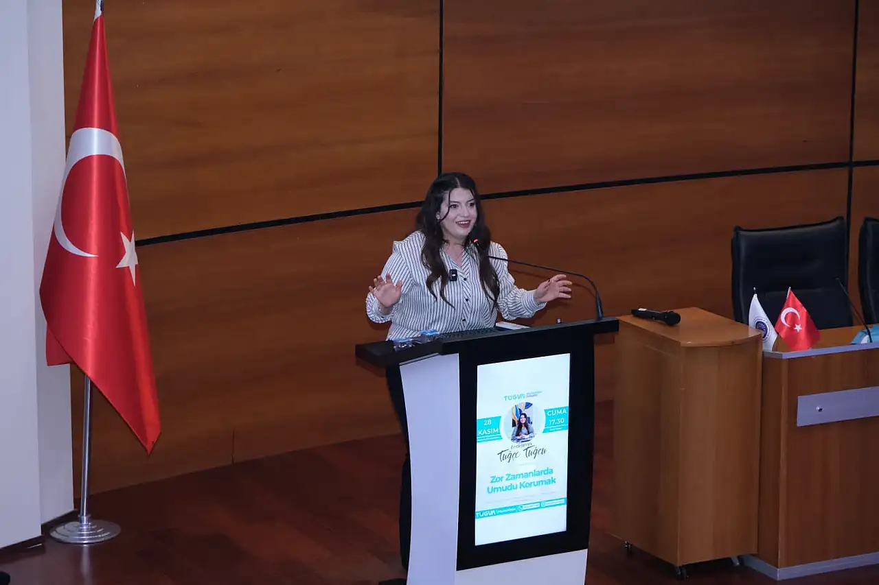 TÜGVA, Erzurum'da 'Zor Zamanlarda Umudu Korumak' programını düzenledi. Psikolog Tuğçe Tuğcu, gençlere stres ve motivasyon üzerine teknikler sundu. Program, katılımcıların sorularıyla etkileşimli geçti ve benzer etkinliklerin devam edeceği açıklandı.