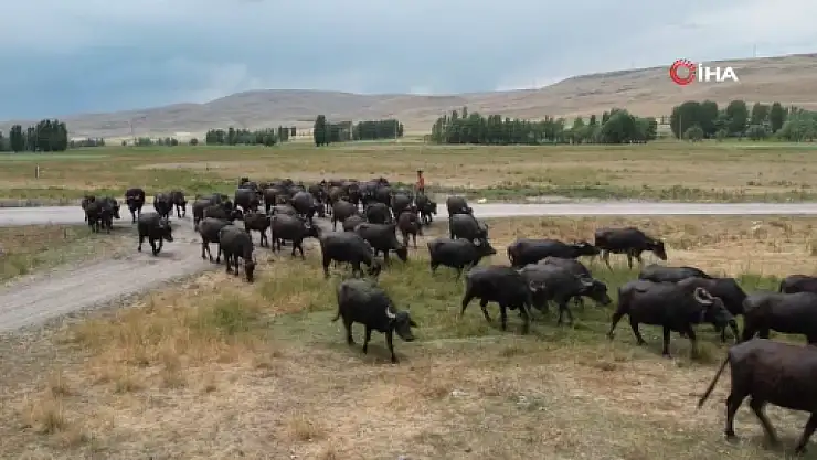 Erzurum'un Aziziye ilçesi Söğütlü köyündeki mandaların dere içindeki banyo keyfi manzarası, adeta Tanzanya'nın Serengeti Milli Parkı'nı akıllara getiriyor.