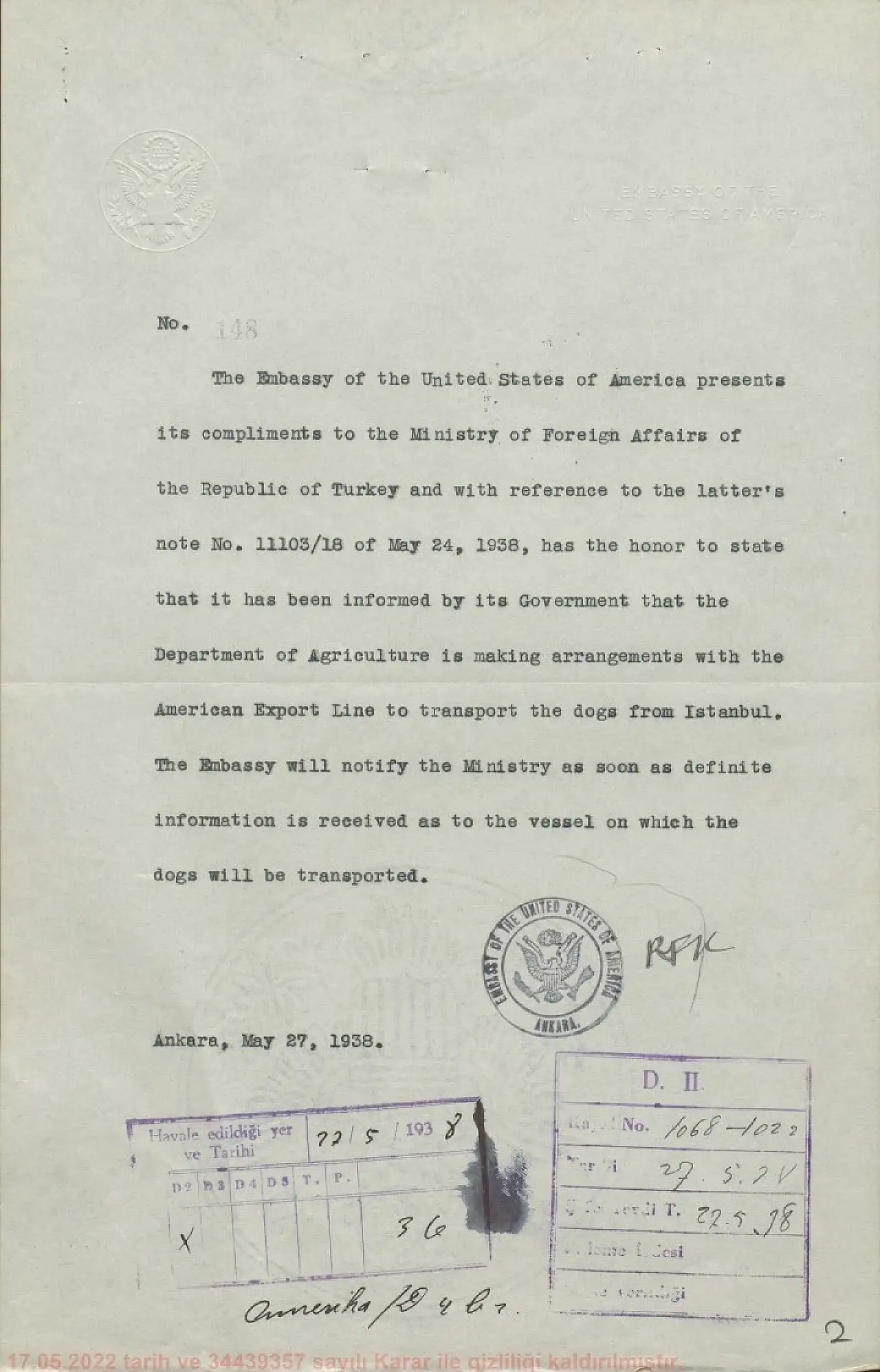 1938 yılına tarihlenen belgede, Erzurum’un çoban köpeklerinin özellikle tercih edilme sebebi olarak dayanıklılıkları, zekâları, sürü yönetimindeki becerileri ve sert iklim koşullarına uyumları öne çıkıyor. Bu nitelikler, Erzurum’un uzun yıllardır bilinen hayvancılık kültürünün, uluslararası düzeyde dahi dikkat çektiğini gösteriyor. Amerikan Ziraat Nezareti’nin talep ettiği köpeklerin özellikle Erzurum yöresinden satın alınması, bölgenin yetiştirici kimliğinin 20. yüzyılın ilk yarısında bile ne kadar güçlü olduğunu kanıtlıyor. Yazışmada, köpeklerin Aygır Deposu’na ulaştırılmasının ardından süreç hakkında Amerikan Büyükelçiliğinin resmen bilgilendirildiği ifade ediliyor. Buna karşılık elçilikten gelen notada, Amerikan Ziraat Nezareti’nin çoban köpeklerini Amerika’ya taşımak için "American Export Line" ile anlaşmak üzere olduğu, uygun vapur bulunduğunda Türk makamlarının haberdar edileceği belirtiliyor. Bu ifade, hayvan naklinin dahi dönemin diplomatik ilişkilerinde ciddi bir prosedür gerektirdiğini ortaya koyuyor.