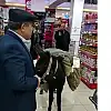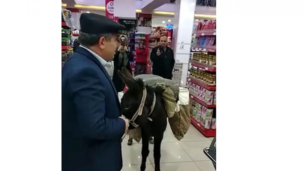 Niğde'de bir vatandaş, Terminal Caddesi üzerindeki bir markete eşekle gelerek alışveriş yaptı. Eşeği ile reyonları gezen vatandaşı diğer müşteriler cep telefonu ile görüntüledi. Alışverişi tamamlayan vatandaş, poşet parası vermemek için aldıkları ürünleri eşeğin heybesine koydu.