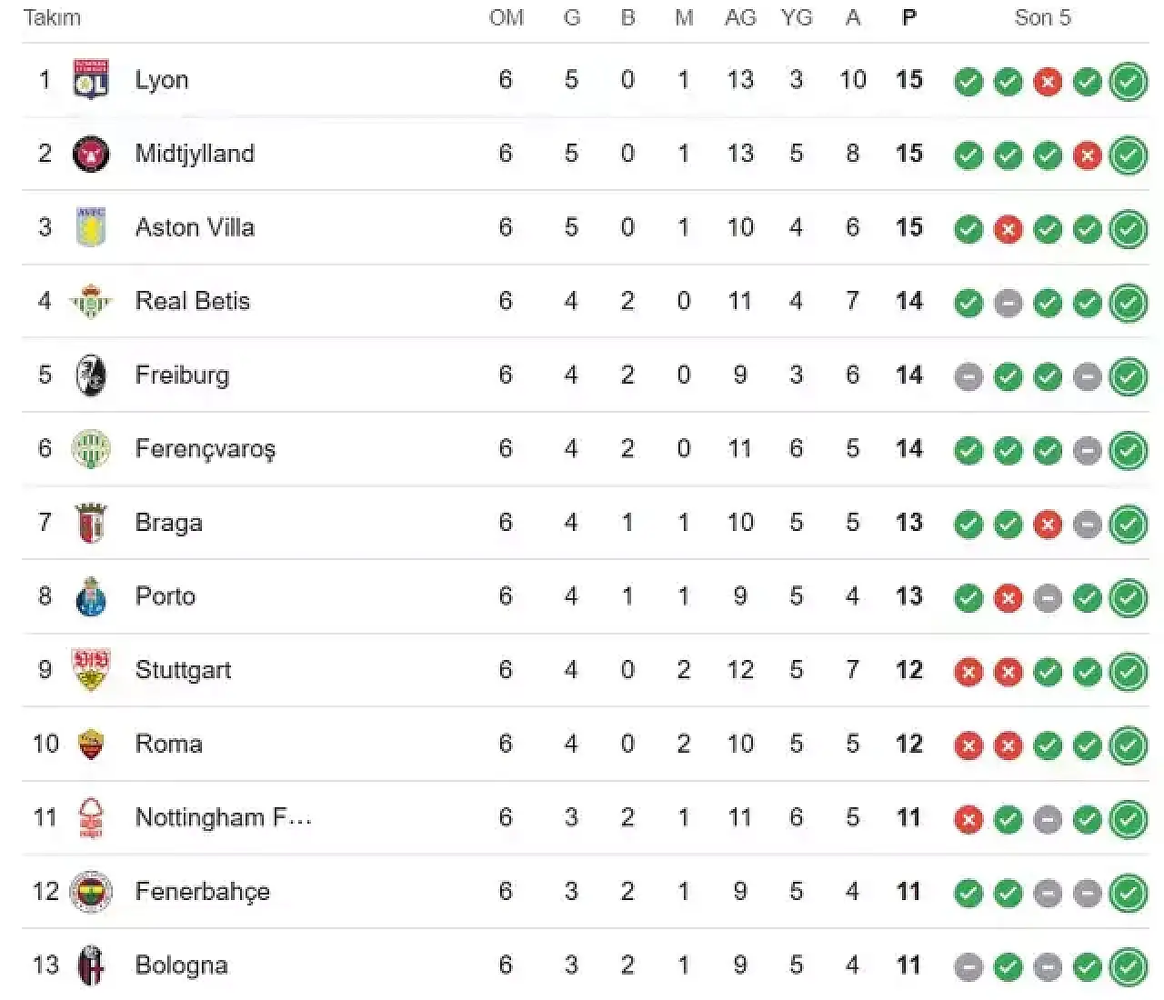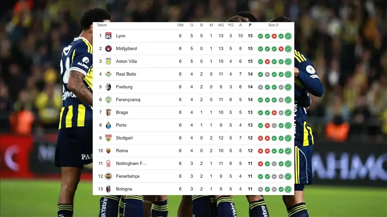 UEFA Avrupa Ligi'nde 7. hafta öncesindeki ilk 12 sıra ve puan dağılımı şu şekilde oluştu:Sıra Takım Maç Puan Averaj 1 Olympique Lyon 6 15 +10 2 FC Midtjylland 6 15 +8 3 Aston Villa 6 15 +6 4 Real Betis 6 14 +7 5 SC Freiburg 6 14 +6 6 Ferencváros 6 14 +5 7 SC Braga 6 13 +5 8 FC Porto 6 13 +4 9 VfB Stuttgart 6 12 +7 10 AS Roma 6 12 +5 11 Nottingham Forest 6 11 +5 12 Fenerbahçe 6 11 +4