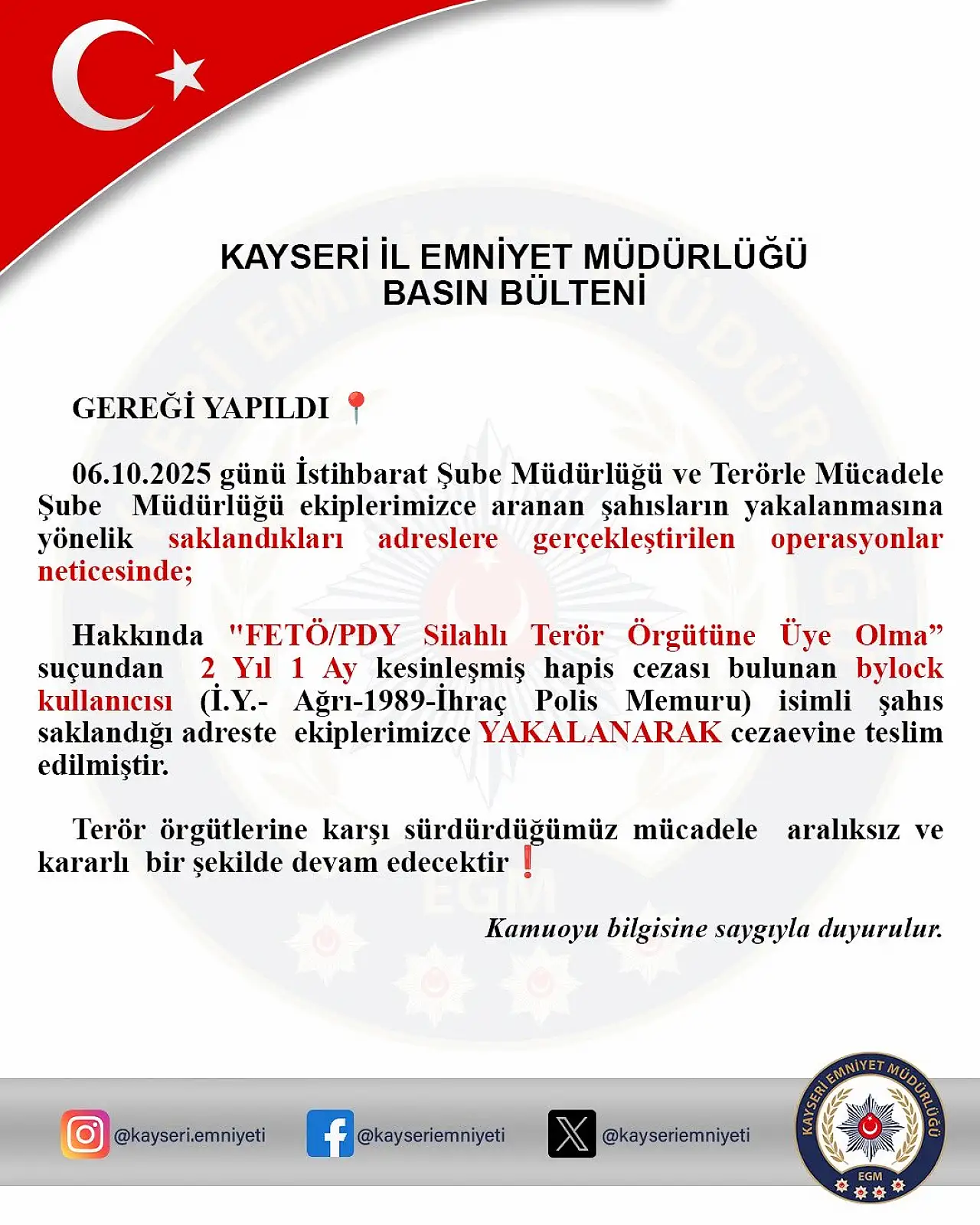 Kayseri İl Emniyet Müdürlüğü ekipleri, terör örgütü üyeliğinden aranan eski polis memurunu düzenlenen operasyonla yakaladı. Kayseri İl Emniyet Müdürlüğü İstihbarat Şube Müdürlüğü ve Terörle Mücadele Şube Müdürlüğü ekiplerince, aranan şahısların yakalanmasına yönelik yürütülen çalışmalar kapsamında operasyon gerçekleştirildi. Ekiplerin belirlediği adrese yapılan baskında, hakkında “FETÖ/PDY Silahlı Terör Örgütüne Üye Olma” suçundan 2 yıl 1 ay kesinleşmiş hapis cezası bulunan ve ByLock kullanıcısı olduğu tespit edilen ihraç polis memuru İ.Y. (36) yakalanarak gözaltına alındı.