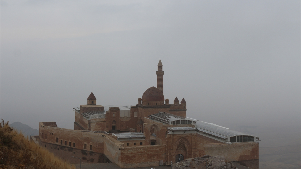 Doğubayazıt ilçesinde sabah saatlerinde etkisini artıran sis, bölgenin simge yapılarından biri olan İshak Paşa Sarayının çevresini tamamen kapladı. Soğuk hava koşullarının sürdüğü ilçede günün ilk ışıklarıyla birlikte ortaya çıkan sis tabakası, tarihi yapının etrafında yoğun şekilde hissedildi.