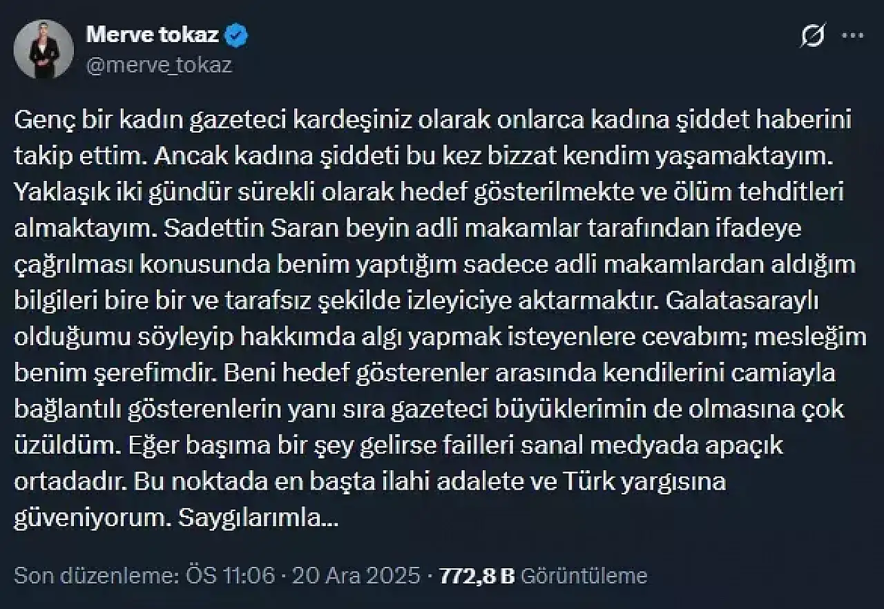 Merve Tokaz, kendisini hedef alanlar arasında bazı meslektaşlarının da bulunduğunu iddia ederek buna üzüldüğünü dile getirdi. Hakkında “taraftarlık” üzerinden algı oluşturulmaya çalışıldığını söyleyen Tokaz, gazetecilik etiğine uygun şekilde, yargı sürecine dair bilgileri aktarmanın bir suç olmadığını ve bunun kamuoyunu bilgilendirme görevinin bir parçası olduğunu kaydetti.