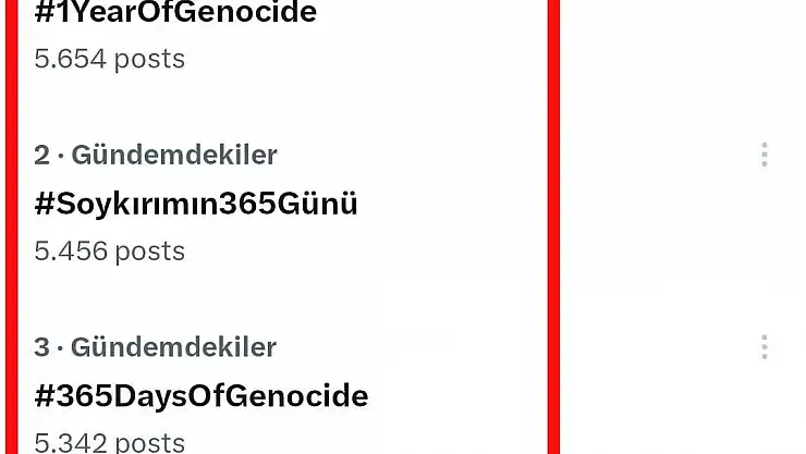 İsrail'in Gazze'ye yönelik uyguladığı soykırımın birinci yılı için açılan "#1YearOfGenocide" etiketi, X gündeminde listenin birinci sırasına yerleşti. 1 yıldır süren soykırıma tepki olarak açılan etiket dünya gündemine de girdi. "#Soykırımın365Günü" ve "#365DaysOfGenocide" etiketleri de listede yerini aldı. Türkiye gündeminde 1. sıraya yerleşen etiket çalışması kısa sürede dünya gündemine de yerleşti.