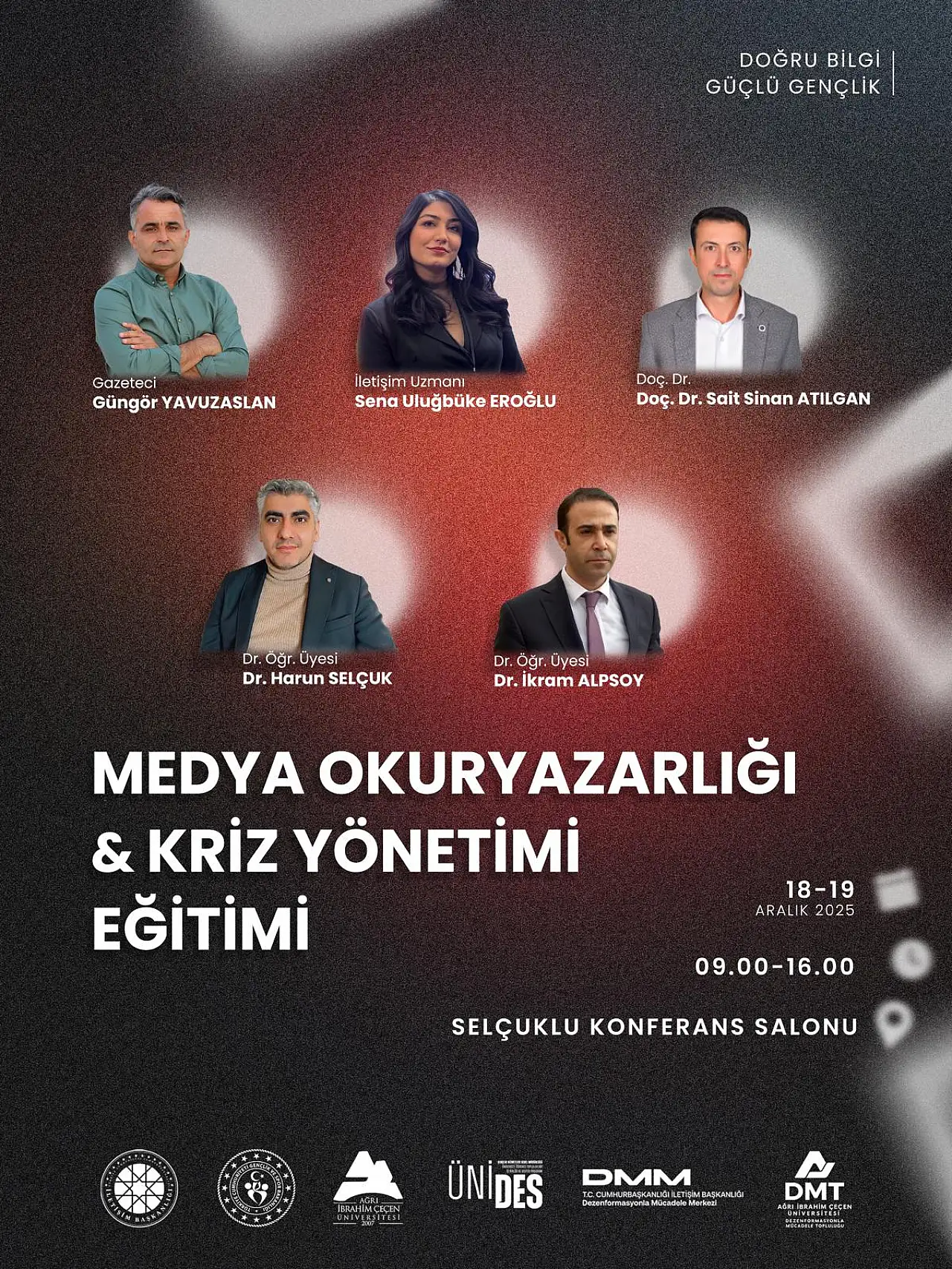 Program kapsamında; gazeteci Güngör Yavuzaslan, iletişim uzmanı Sena Ulugüblike Eroğlu, Doç. Dr. Sait Sinan Atılgan, Dr. Öğr. Üyesi Harun Selçuk ve Dr. Öğr. Üyesi İkram Alpsoy tarafından sunumlar gerçekleştirildi. Konuşmacılar, medya okuryazarlığının bireyler ve özellikle gençler açısından taşıdığı öneme değinirken, kriz anlarında doğru bilgi yönetiminin kamuoyunu bilgilendirme sürecindeki rolünü ele aldı.