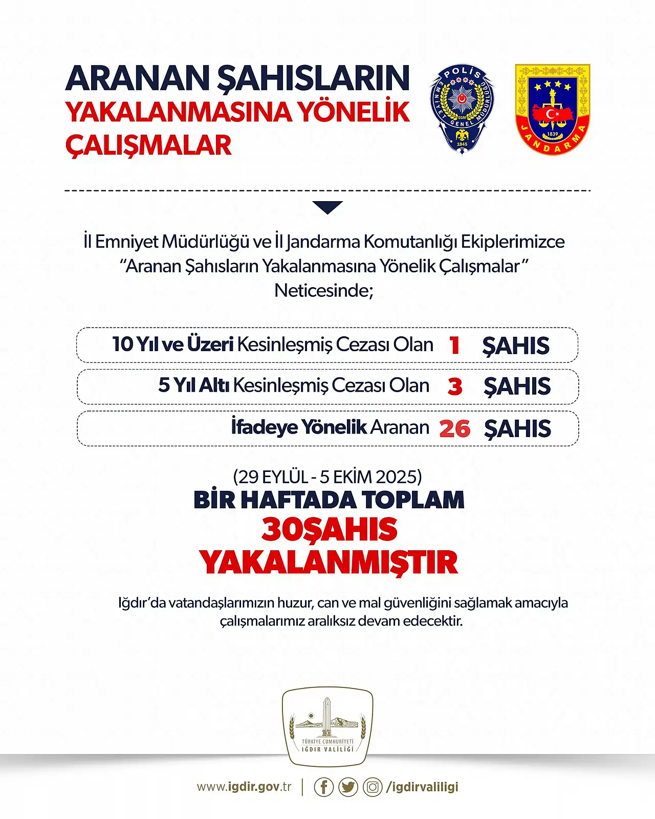 Iğdır İl Emniyet Müdürlüğü ve İl Jandarma Komutanlığı ekipleri, 29 Eylül - 5 Ekim 2025 tarihleri arasında Aranan Şahısların Yakalanmasına Yönelik Çalışmalar kapsamında toplam 30 şahsı yakaladı.