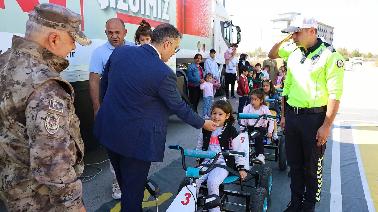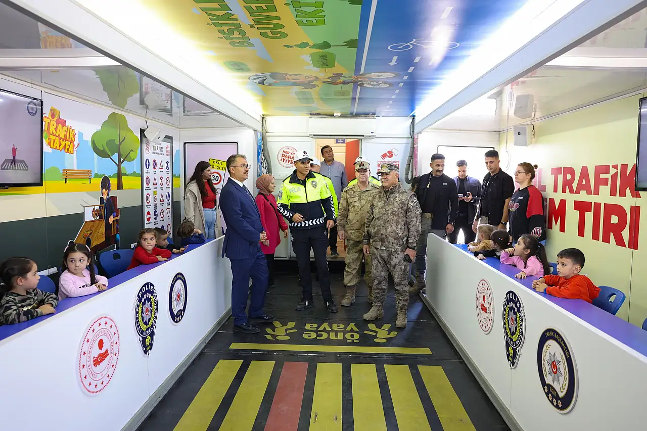 Iğdır'da Vali Ercan Turan, İl Emniyet Müdürü Niyazi Turgay ve İl Jandarma Komutanı Tuğgeneral Zafer Özden, çocuklara trafik bilincini kazandırmak amacıyla Mobil Trafik Eğitim Tırını ziyaret etti.