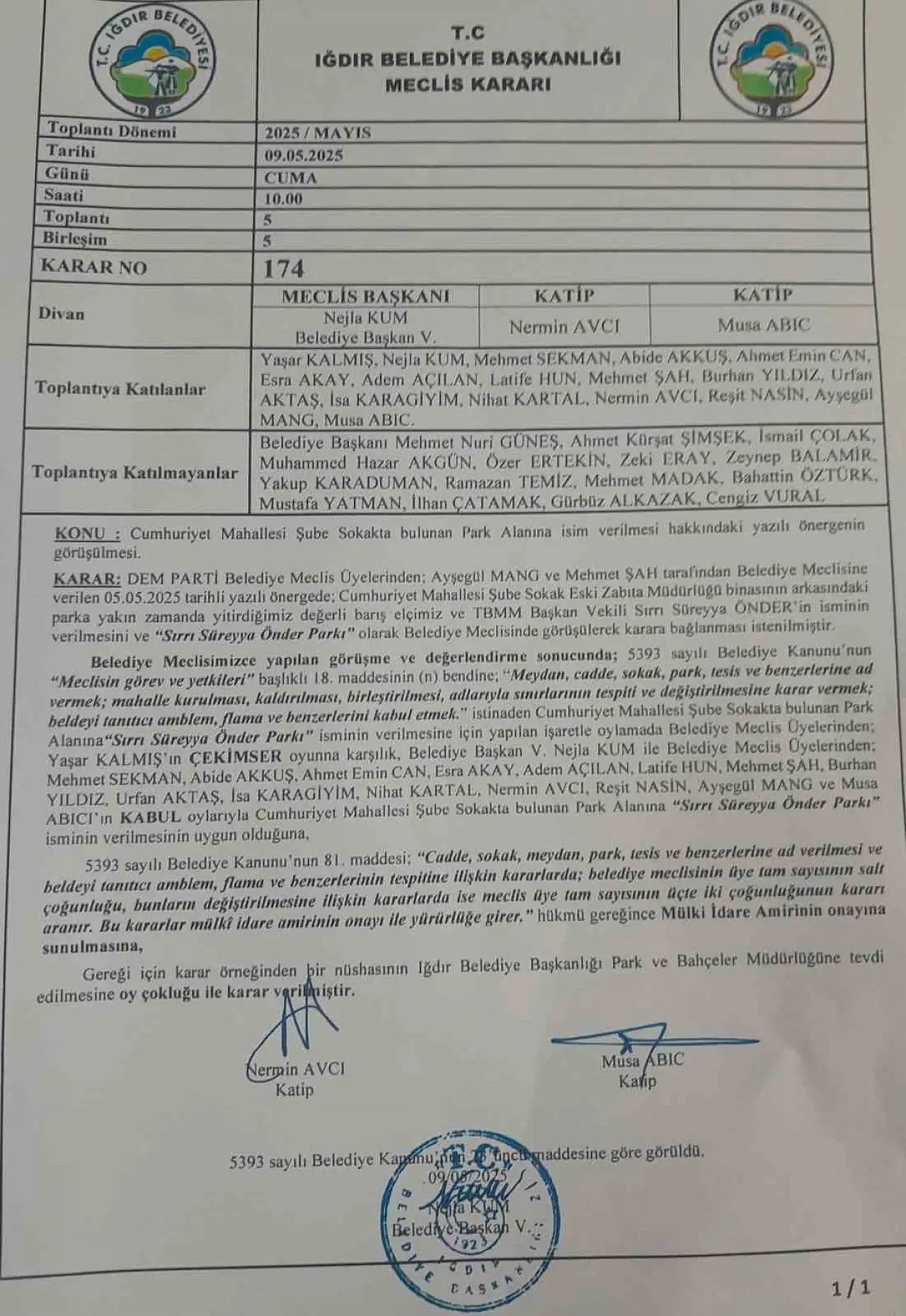 Iğdır Belediyesi, İstanbul’da 3 Mayıs’ta hayatını kaybeden TBMM eski Başkanvekili ve DEM Parti İstanbul Milletvekili Sırrı Süreyya Önder’in adının, Cumhuriyet Mahallesi Şube Sokak’taki Eski Zabıta Müdürlüğü binasının arkasındaki parka verilmesini kararlaştırdı ancak aradan geçen 5 aya rağmen kararın onaylanmaması tepki topladı.