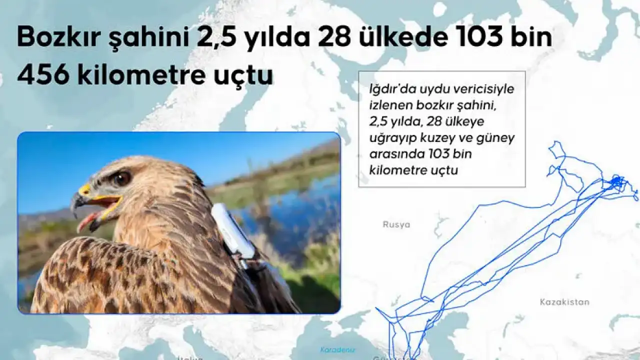 Iğdır’ın Tuzluca ilçesine bağlı Yukarı Çıyrıklı köyündeki Aras Kuş Araştırma ve Eğitim Merkezi, kıtalar arası göç eden kuş türlerinin rotalarını ortaya çıkaran çalışmalarıyla dikkat çekiyor. KuzeyDoğa Derneği’nin yürüttüğü uydu vericili kuş takip projesi kapsamında 9 Nisan 2023’te yakalanan bir bozkır şahinine (Buteo buteo vulpinus) takılan verici, kuşun 2,5 yılda 103 bin 456 kilometrelik olağanüstü bir yolculuğunu kaydetti.