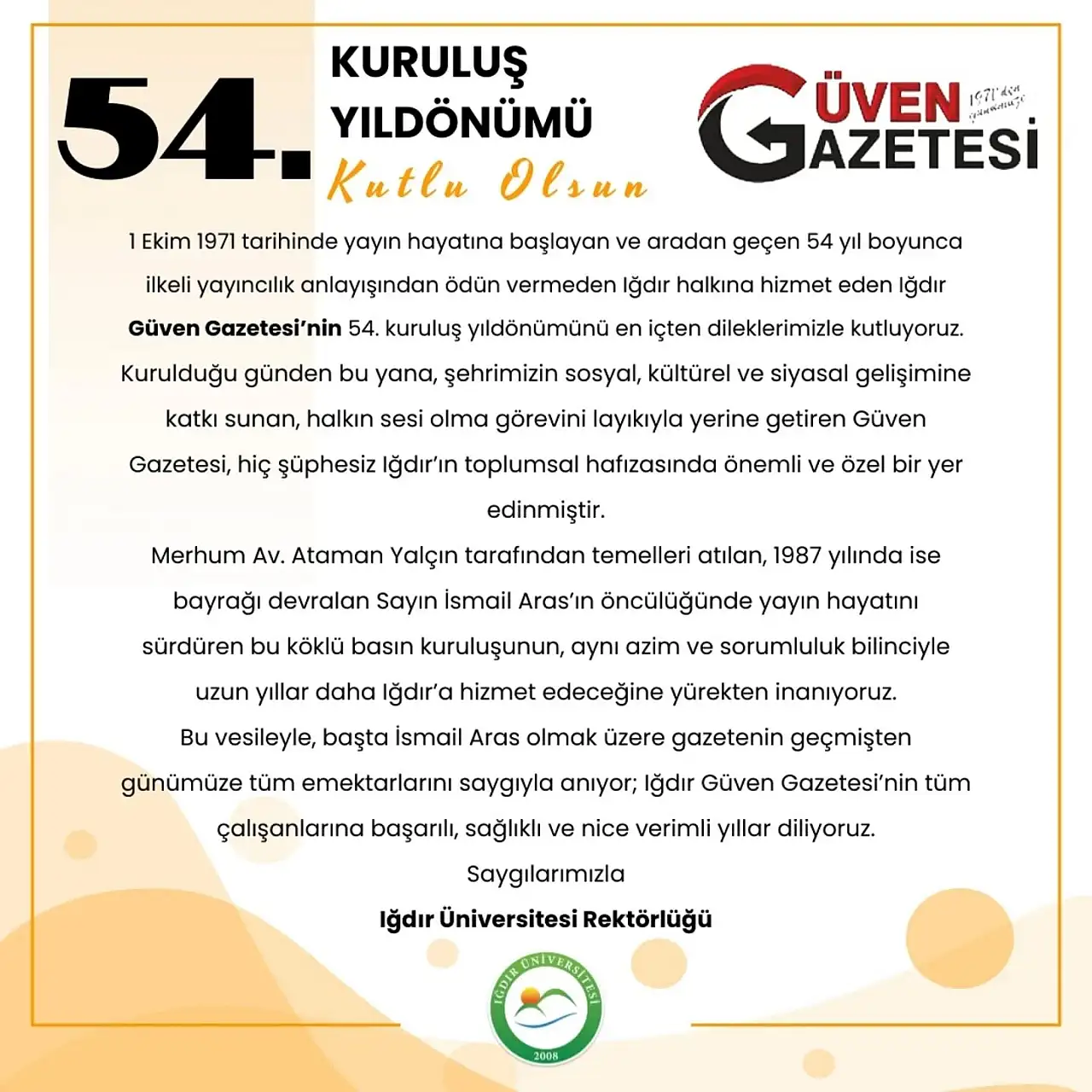 Iğdır'ın köklü basın kuruluşlarından Iğdır Güven Gazetesi, 1 Ekim 1971'de yayın hayatına başlamasının 54. yılını kutluyor.