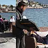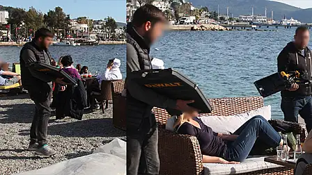 Bodrum’da sahil kenarında güneşlenen turistlere matkap satmaya çalışan seyyar satıcılar görenleri şaşırttı.