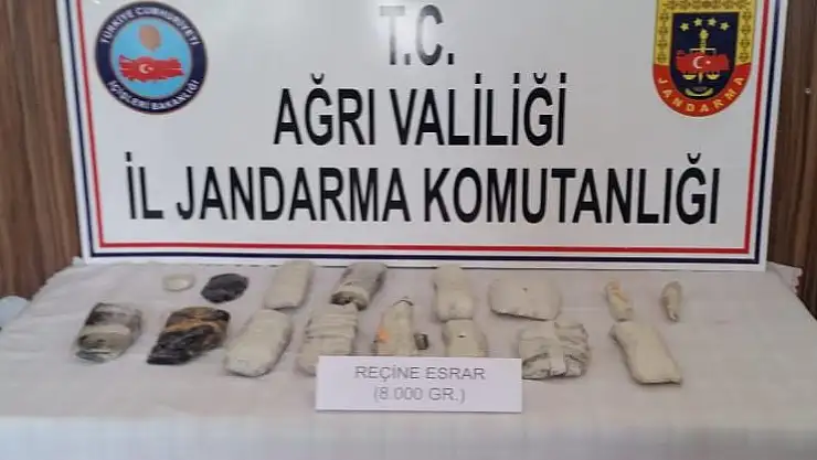 Ağrı'nın Diyadin ilçesi İpekyolu Geçidi'nde yolcu otobüsünde bulunan 4 Afganistanlı kaçak göçmen üzerinde yapılan aramalarda 8 kilogram reçine esrar ele geçirildi.
