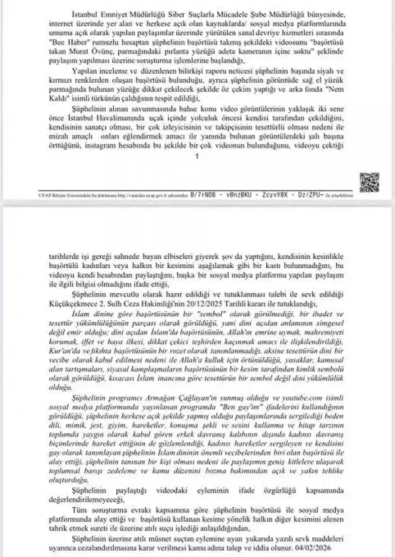 Soruşturma dosyasında, Murat Övüç’ün toplumun bir kesimini diğer kesimine karşı alenen tahrik ettiği savunuldu. Savcılık, Türk Ceza Kanunu’nun ilgili maddeleri uyarınca cezalandırılmasını istediği Övüç’ün dosyasını Asliye Ceza Mahkemesi’ne gönderdi.