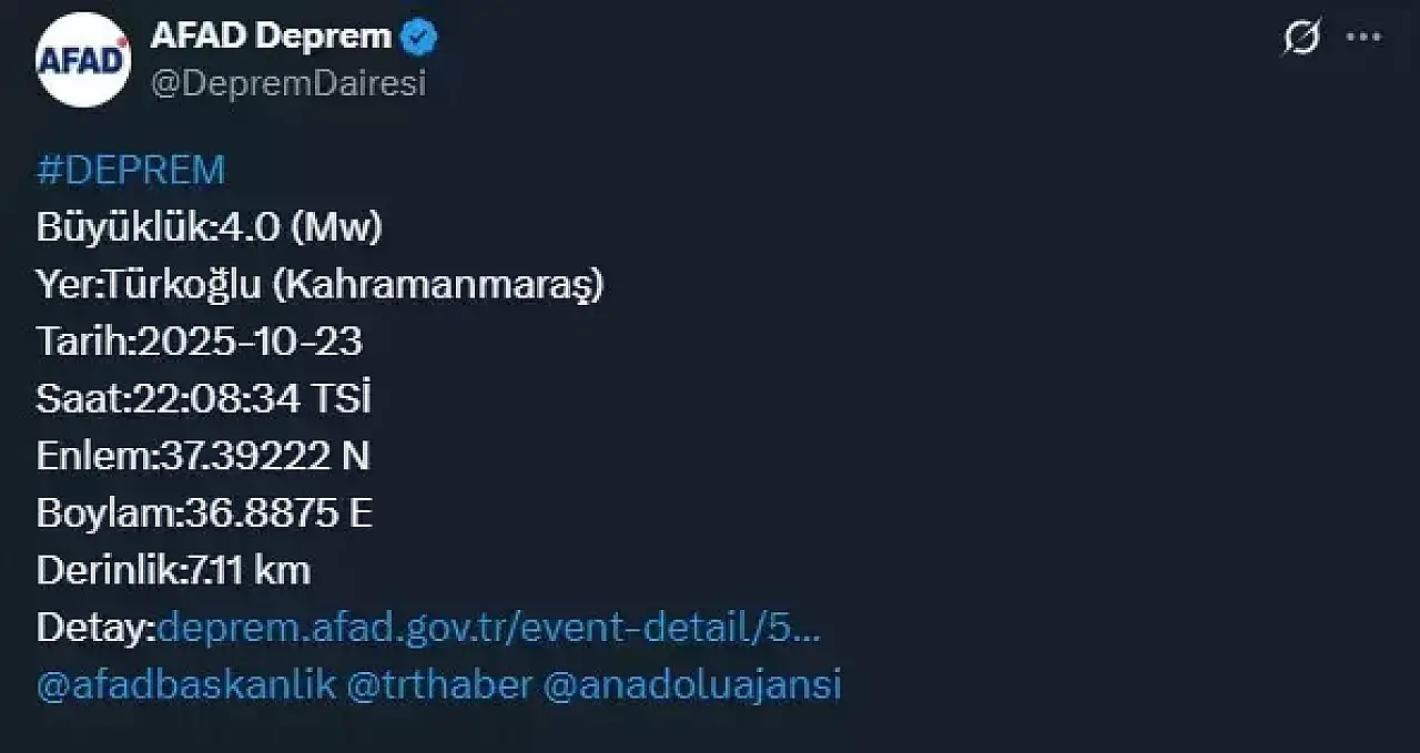 Kahramanmaraş'ın Türkoğlu ilçesi, akşam saatlerinde yaşanan 4.0 büyüklüğündeki depremle yeniden tedirgin anlar yaşadı. Afet ve Acil Durum Yönetimi Başkanlığı (AFAD) tarafından yapılan açıklamaya göre, sarsıntı saat 22.08'de meydana geldi.