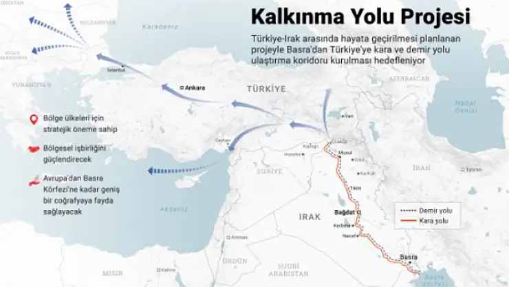 Kalkınma Yolu Projesi, Türkiye'yi Basra Körfezi'ndeki Faw Limanı'na bağlamayı hedefliyor. Bu proje, aynı zamanda Fırat ve Dicle nehirlerinin denize döküldüğü Şattülarap'ın ağzında yer alıyor. Projenin güzergahı, Divaniye, Necef, Kerbela, Bağdat ve Musul'dan geçerek Türkiye sınırına ulaşacak şekilde tasarlandı. Bu yolu kullanarak Türkiye'nin Mersin Limanı'na ve ardından Avrupa'ya ulaşması planlanıyor.
