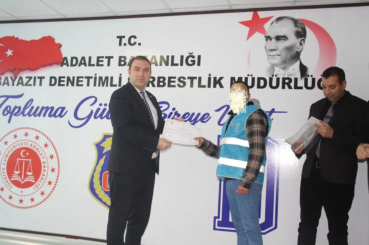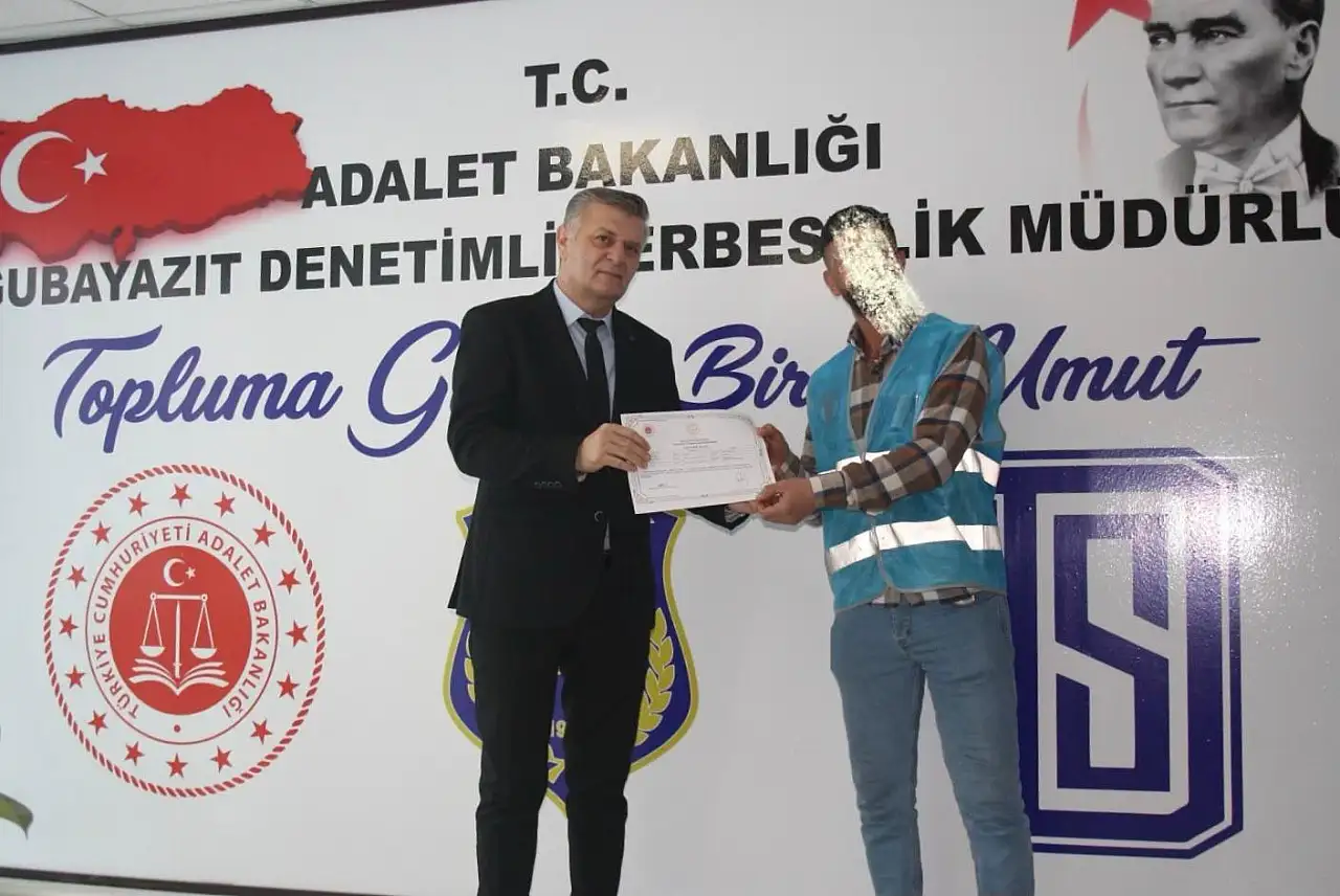 Doğubayazıt’ta, Denetimli Serbestlik Müdürlüğü binasında düzenlenen programda, Halk Eğitim Müdürlüğü iş birliğiyle açılan “Doğalgaz Yakıtlı Kalorifer Ateşçiliği” kursunu başarıyla tamamlayan hükümlülere belgeleri verildi.