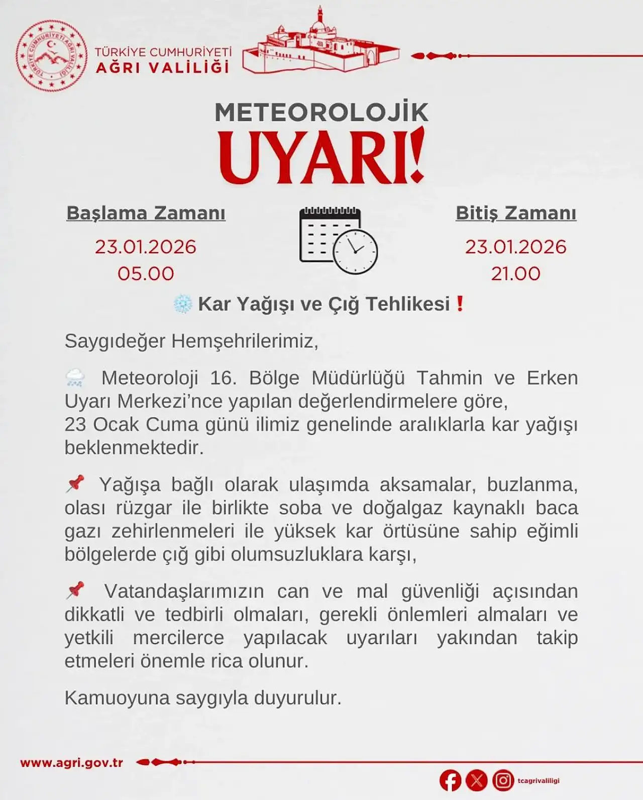 Ağrı Valiliği tarafından yapılan açıklamada, Meteoroloji 16. Bölge Müdürlüğü Tahmin ve Erken Uyarı Merkezi'nin değerlendirmelerine yer verildi.