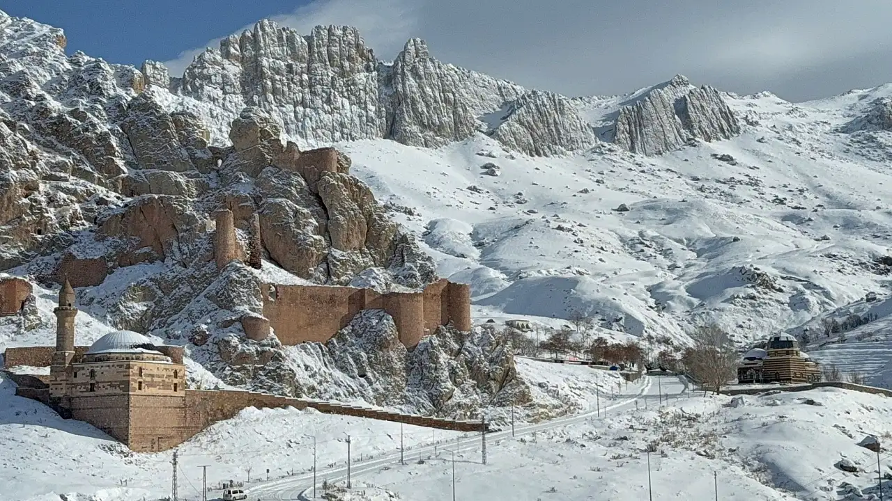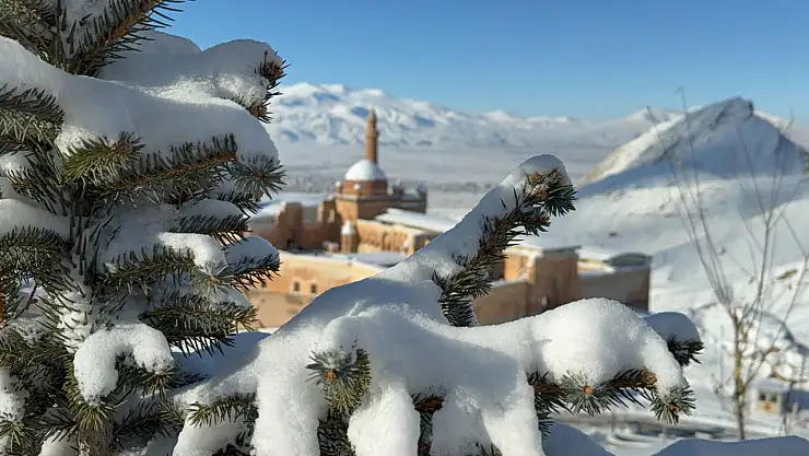Kar yağışıyla beyaza bürünen İshak Paşa Sarayı, kış aylarında da ziyaretçilerin ilgisini çekiyor.