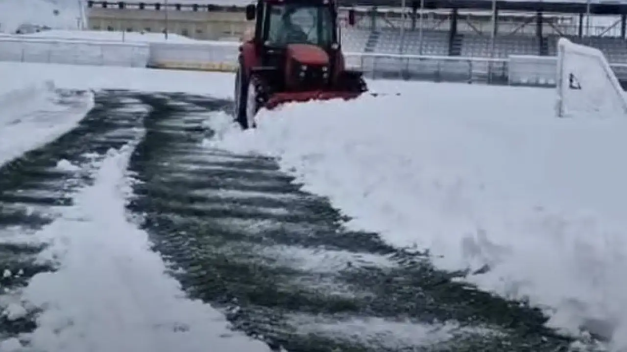 Karla kaplanan 1071 Sultan Alparslan Spor Kompleksi'ndeki sentetik çim futbol sahası, Muş Gençlik ve Spor İl Müdürlüğü ekiplerinin kar küreme ve temizlik çalışmalarıyla amatör müsabakalara hazır hâle getirildi.