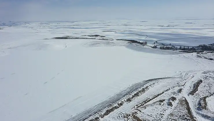 Selim ilçesinde, Bozkuş Deresi üzerinde içme ve sulama amaçlı inşa edilen Bayburt Barajı, kışın gelişiyle tamamen dondu. Kar yağışının ardından beyaz örtüye bürünen baraj ve çevresi dron ile havadan görüntülendi.
