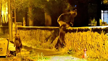 Kars'ın Sarıkamış ilçesinde mahalleye inen bir bozayı ve 2 yavrusu, yiyecek ararken görüntülendi.