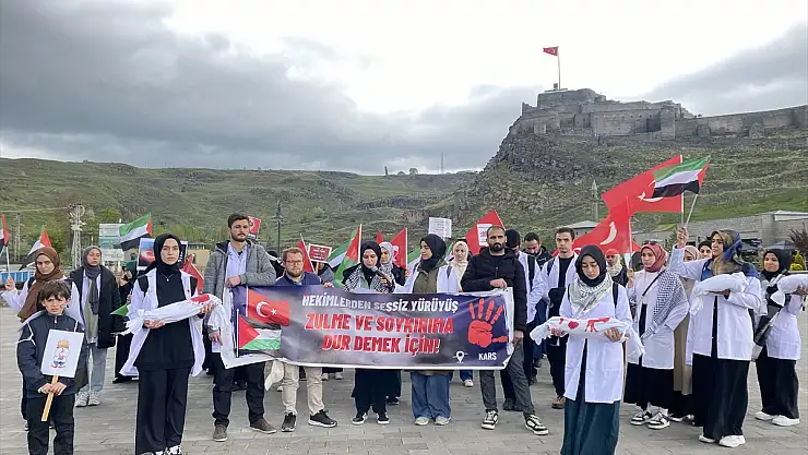 Fethiye Camisi'nin önünde bir araya gelen doktorlar ve sağlık çalışanları, taşıdıkları dövizlerin yanı sıra Türk ve Filistin bayraklarıyla sağanağa rağmen Kars Kalesi bölgesindeki Gazi Kars Bedesten'e kadar sessiz yürüyüş yaptı.