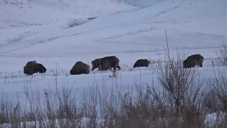Kars-Kağızman kara yolu üzerindeki yerleşim yerlerine kadar inen domuz sürüsü, vatandaşların yaz mevsiminde ektiği ve hasattan arta kalan patateslerle beslendi. Kar altında kalan mahsulleri çıkararak karınlarını doyuran sürü, çevredeki tehlikelere aldırış etmeden hareket etti.