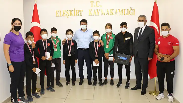 Eleşkirt Gençlik Spor bünyesinde Çıktıkları müsabakalarda Türkiye derecesi elde eden güreş ve atletizm sporcuları; Ağrı Gençlik ve Spor Müdürü İsmail Çalgan ve Eleşkirt Gençlik Spor Müdürü Sabahattin Güzel ile Eleşkirt Kaymakamı Mustafa Duruk’a ziyaret gerçekleştirdi.