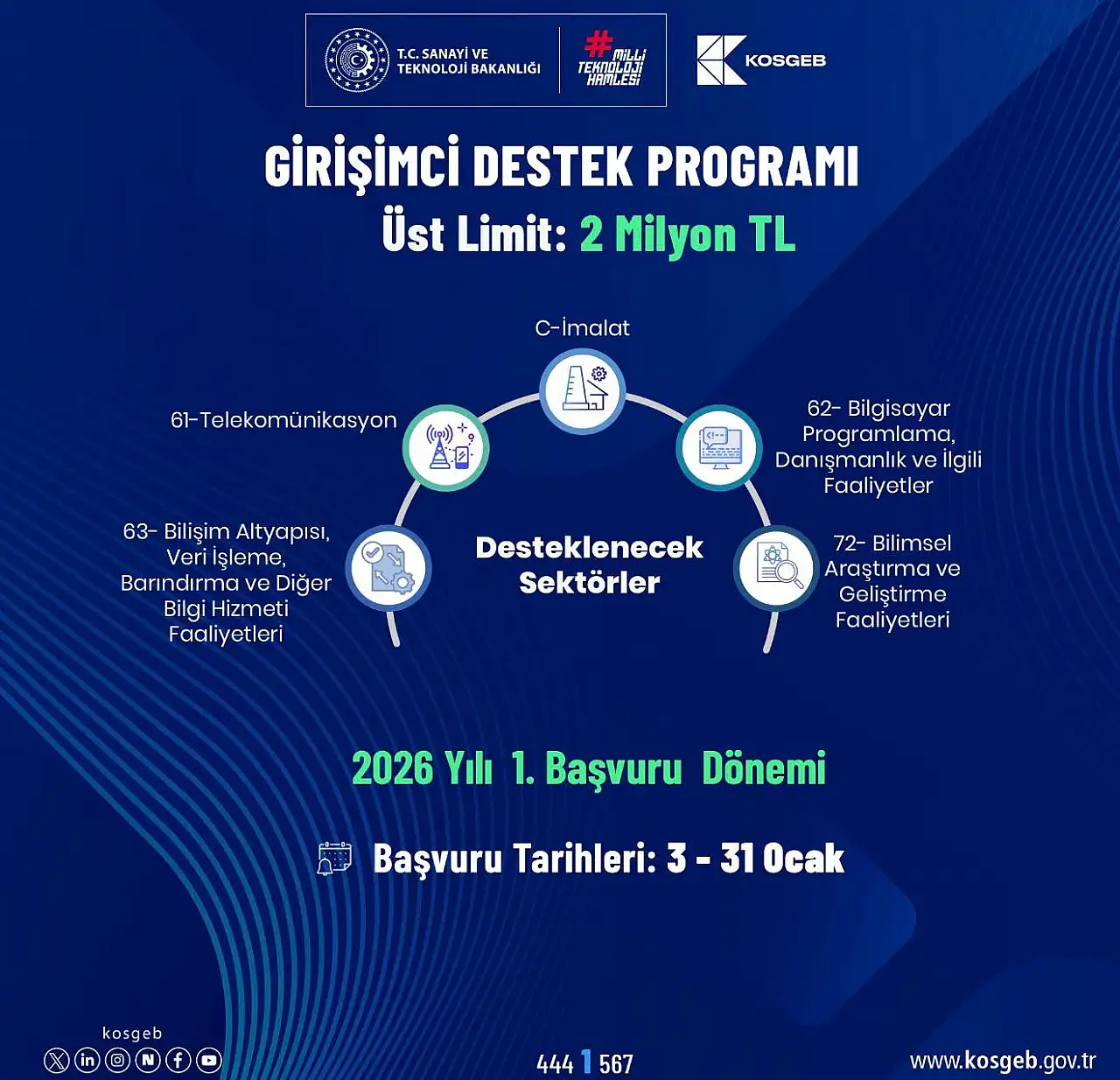 KOSGEB tarafından yürütülen Girişimci Destek Programı kapsamında 2026 yılı 1. başvuru dönemi başladı imalat ve teknoloji ağırlıklı sektörleri kapsayan programda girişimcilere 2 milyon TL'ye kadar destek sağlanacak.