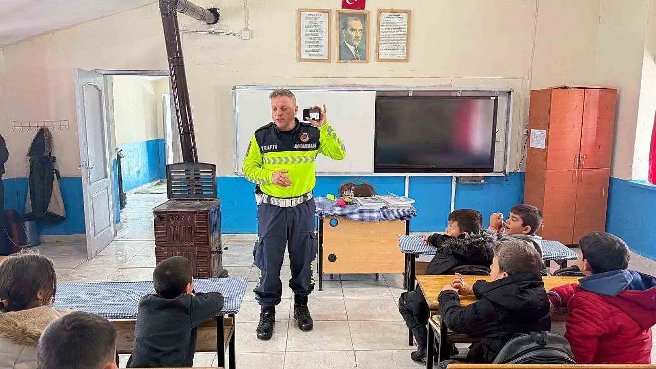 Muş'un Malazgirt ilçesinde jandarma ekipleri, iki okulda öğrenim gören 52 öğrenciye trafik güvenliği eğitimi verdi.