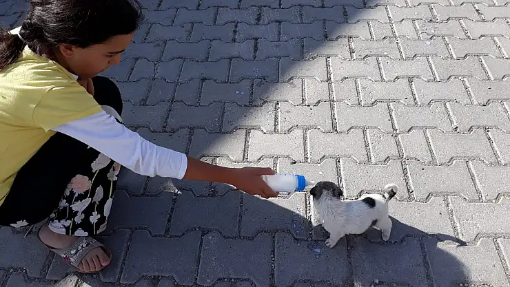 Ağrı'da sokakta bulduğu sahipsiz yavru köpeğe sahip çıkan kız çocuğu köpeği biberon ile besleyerek hayatta kalmasını sağlıyor.