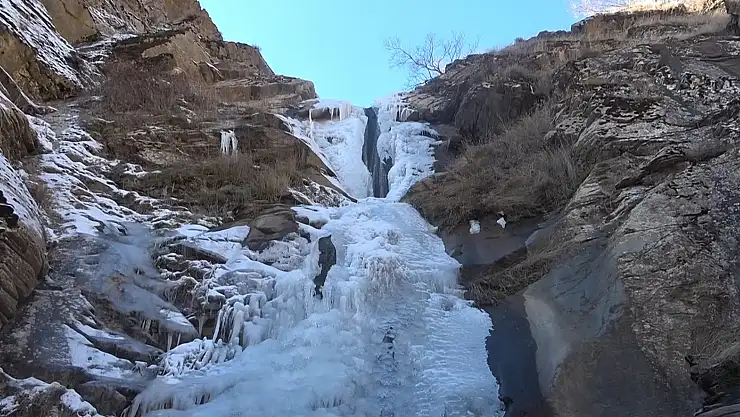 Muş'ta etkili olan dondurucu soğuklar, doğayı adeta bir buz diyarına çevirdi. Hava sıcaklıklarının sıfırın altına düşmesiyle birlikte nehirler, dereler, göletler ve şelaleler buz tuttu.