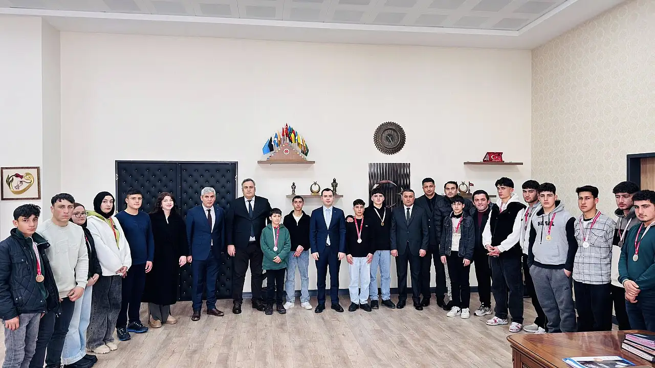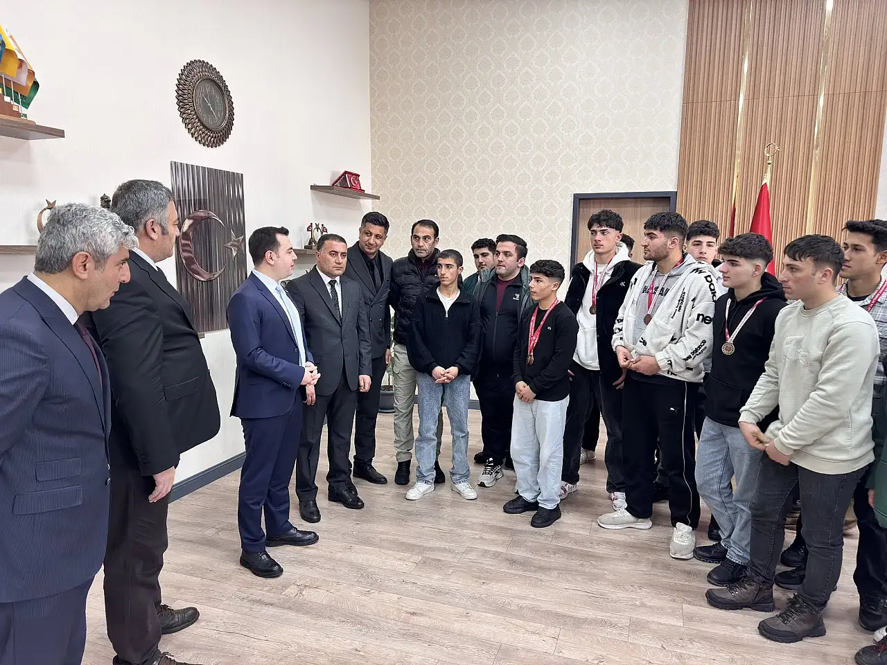 Hasköy Kaymakamı İsmail Güney, il birincisi sporcuları ve öğretmenlerini tebrik etti.