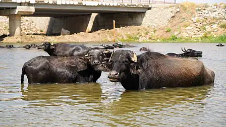 Türkiye’nin önemli hayvancılık merkezlerinden biri olan Muş’ta yaz aylarının kavurucu sıcaklarından etkilenen mandalar, hem serinlemeleri hem de şap hastalığına karşı korunmaları amacıyla dere ve göletlerde yüzdürülüyor. Günde birkaç saat suda kalan mandalar, stres atarken hastalıklara karşı da daha dirençli hale geliyor.