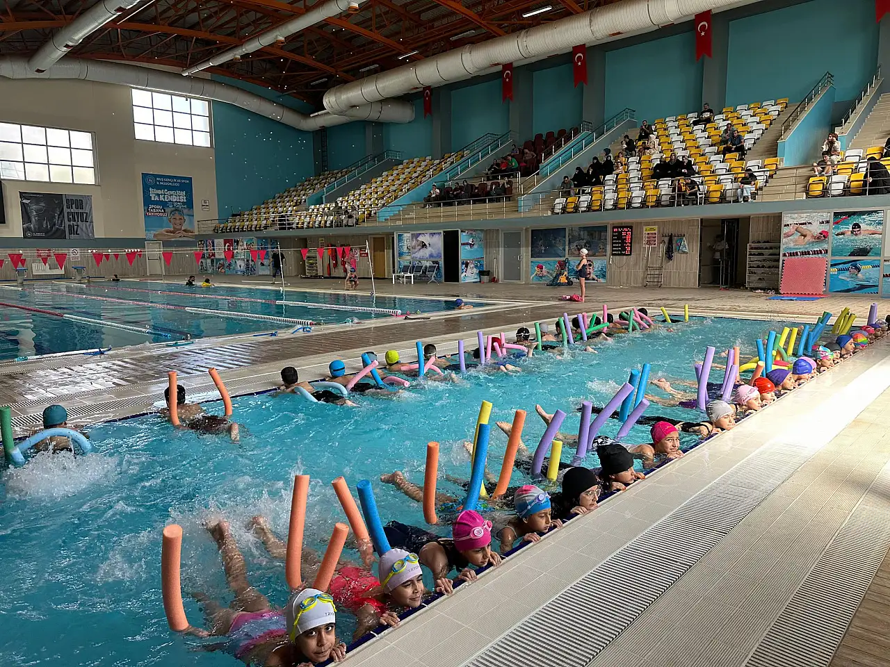 Yüzme Bilmeyen Kalmasın projesiyle çocuklar, Muş'taki yarı olimpik havuzda yüzme eğitimi alıyor ve su sporlarının keyfini çıkarıyor.