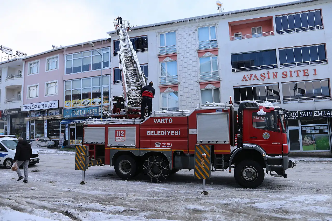 İlçede etkili olan soğuk hava koşulları nedeniyle çatı ve yüksek binalarda oluşan buzlanmanın vatandaşlar için risk oluşturması üzerine, Varto Belediyesi ekipleri harekete geçti.