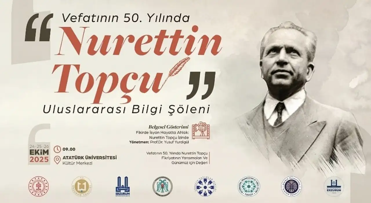Anadolu ve İslam medeniyeti sentezi için çabalayan, "Hareket" dergisinin kurucusu, sosyolog, felsefeci, yazar ve öğretmen Nurettin Topçu’nun vefatının 50. Yılında memleketi olan Erzurum’da anılacak. 24-25-26 Ekim 2025 tarihleri arasında düzenlenecek olan Nurettin Topçu "Uluslararası Bilgi Şöleni", Atatürk Üniversitesi Kültür Merkezi’nde gerçekleşecek. Programda ayrıca "Fikirde İsyan Hayatta Ahlak. Nurettin Topçu İzinde" isimli bir de belgesel sunulacak. Şölen boyunca, Nurettin Topçu’nun fikriyatının yansımaları ve günümüz için değeri ortaya konulacak.