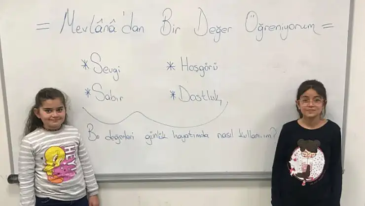 Etkinlikte, Mevlânâ Celâleddîn-i Rûmî’nin sevgi, saygı ve hoşgörü gibi evrensel değerleri birlikte ele alındı. Öğrenciler, bu değerleri tahtaya yazarak günlük yaşamlarında nasıl yaşattıklarını paylaştı ve karşılıklı fikir alışverişinde bulundu.