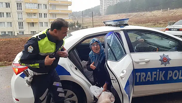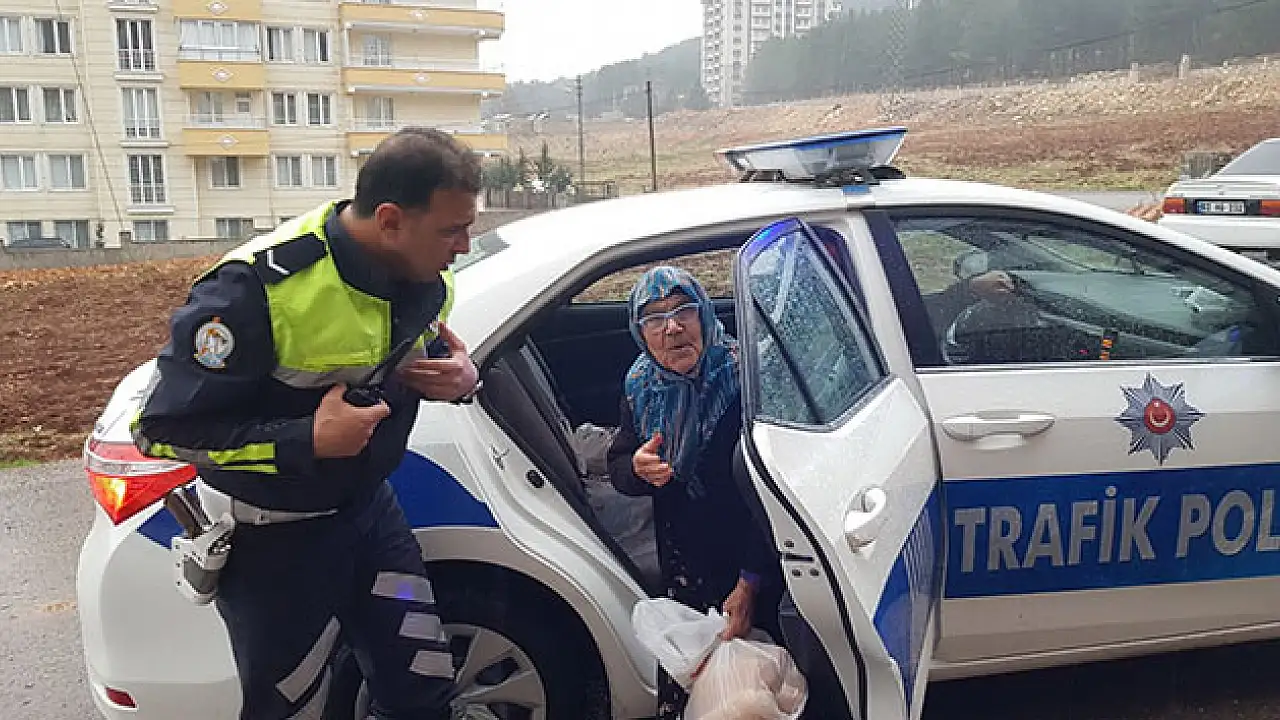 Adıyaman'nda elinde poşetle yol kenarında bekelyen yaşlı bir kadın polis ekipleeri tarafından araç ile evine bırakıldı.