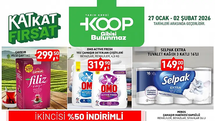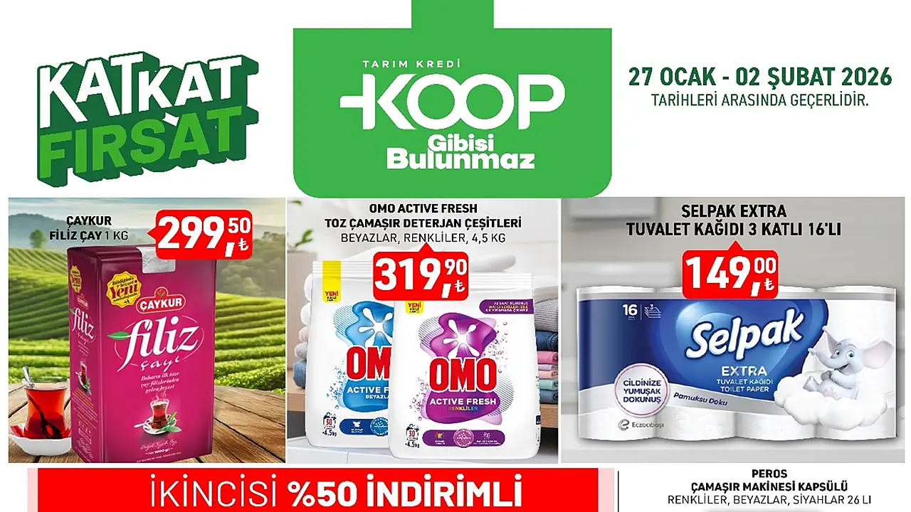 Tarım Kredi KOOP Marketleri, 27 Ocak – 2 Şubat 2026 tarihleri arasında geçerli yeni kampanyasını duyurdu. Çaydan deterjana, tuvalet kağıdından içeceklere kadar birçok üründe dikkat çeken fiyatlar raflara yansıdı.